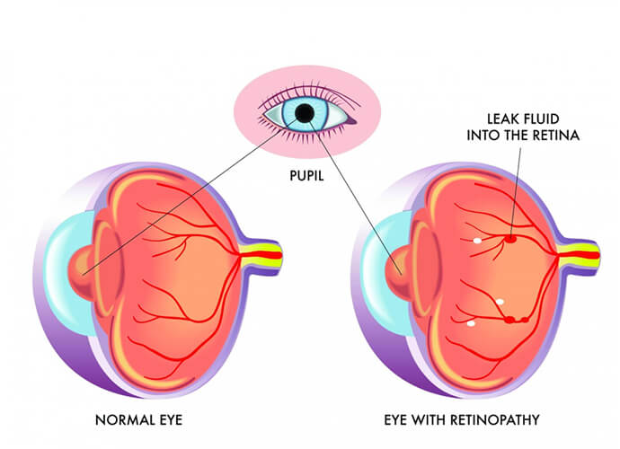 Diabetic eye disease is a major cause of legal blindness in working aged people. The incidence of diabetic eye disease is primarily related to adequacy of blood sugar control and duration of diabetes. After 15 years of diabetes, most will have some signs of diabetic eye disease, most of which is asymptomatic.